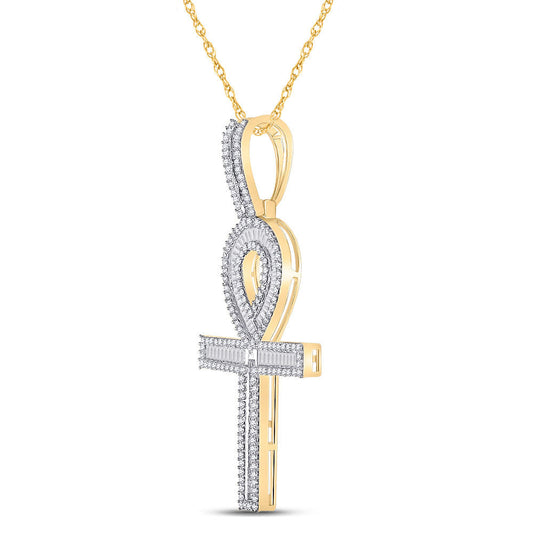 Goldini 10kt Yellow Gold Mens Baguette Diamond Ankh Cross Charm Pendant 1-5/8 Cttw